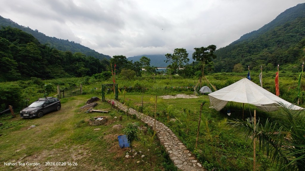অনেকটা জায়গা জুড়ে property, মোটামুটি গোছানো, ছিমছাম। তিনদিকে পাহাড় দিয়ে ঘেরা জায়গা, আরেক দিকে বিশাল Gyaman bridge। মাঝখান দিয়ে বয়ে চলেছে নদী, তবে বর্ষায় বেশ খরস্রোতা। Property র ঠিক মাঝখানে বড় pool, তবে maintenance এর একটু অভাব আছে। তারই একপাশে দুতলা বাড়ি, উপরে থাকার চারটে room, নিচে খাওয়ার ব্যাবস্থা। এছাড়াও বেশ কয়েকটা 3-person tent আছে, pool এর চার পাশে। নদীর ধারে চালা করা বসার ব্যবস্থা, বেশ ভালোই time কাটে সেখানে বসে। তারই পাশ দিয়ে নেমে গেলেই নদী, পা ডুবিয়ে বসে থাকার ব্যাপারটা কিন্তু আলাদাই!! ও হ্যাঁ, দুটো পোষা কুকুর আছে, একজনের বেশ বড়সড় চেহারা!! সে আবার কেউ pool এ নামলেই pool এর চারপাশে চক্কর দিতে দিতে তাকে পাহারা দেয়!! আর আছে একটা পোষা সাদা ঘোড়া! এই সব নিয়ে সময় কেটেছে ভালোই!!