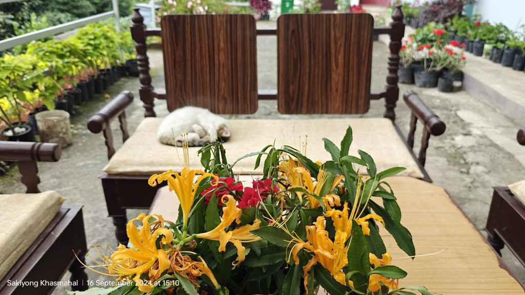 Online এ দেখে নিয়েছিলাম room available আছে। তাই সোজা পৌঁছে গেলাম। Zostel এর নিজস্ব parking নেই, তবে কাছেই আরেকটা homestay র সাথে arrangement করা আছে। সেই মতো room এ ব্যাগপত্তর রেখে গাড়িও park করে চলে এলাম। Zostel এর সামনে নানা রঙিন ফুলের টব দিয়ে সাজানো চত্বর। সেখানে সোফায়, পোষা বিড়ালটারই দখলদারি!! যদিও আমাদের উপস্থিতিতে সে বিশেষ আপত্তি প্রকাশ করেনি। অল্প জায়গায় কিছু সবজি চাষও হচ্ছে। পাখিদের জন্য ভাত রাখা আছে, সেখানে ছোট্ট পাখিদের বেশ ভিড়। তিনতলার ছাদ, সেখান থেকে দূরে পাহাড়ের সারি দেখতে দেখতে বিকেলটা ভালোই কেটে গেলো। পিছন দিকে বড় বড় গাছ, তারই ডালে লতানো গাছে আবার বড় বড় লাল লাল ফল হয়ে রয়েছে। দেখতে খুব সুন্দর হলেও মনে হলো না সেগুলো খাওয়া হয় বলে। সারা দিনের ক্লান্তি, আর কাছাকাছি বিশেষ দোকানপাটও চোখে পড়েনি। তাই এখানেই রাত্রে খাওয়ার কথা বলে দিয়েছিলাম।
